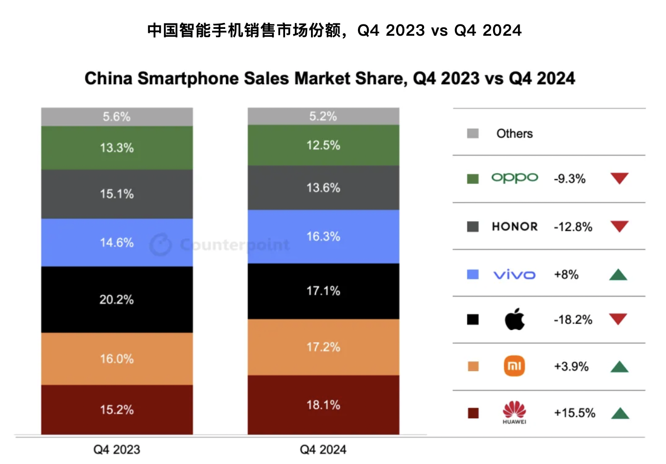 继Canalys发布2024年及去年四季度中国智能手机出货量榜单后,另一家数据分析机构Counterpoint又公布了四季度中国智能手机销量报告。