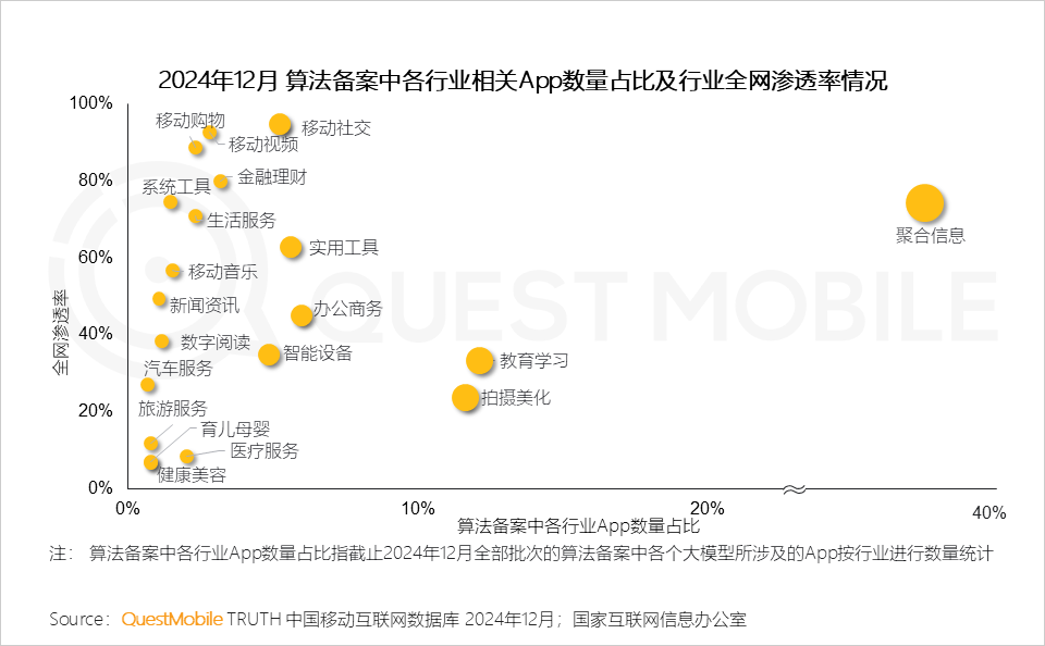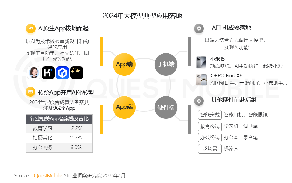 例如,2024年,用户规模在亿级以上的APP中,已经有70%进行了“AI转型”,全行业看,共有962个传统APP备案了“深度合成算法”,其中,教育学习、拍摄美化、办公商务、实用工具、移动社交等行业位居前五,占比分别为12.2%、11.7%、6%、5.6%、5.3%。