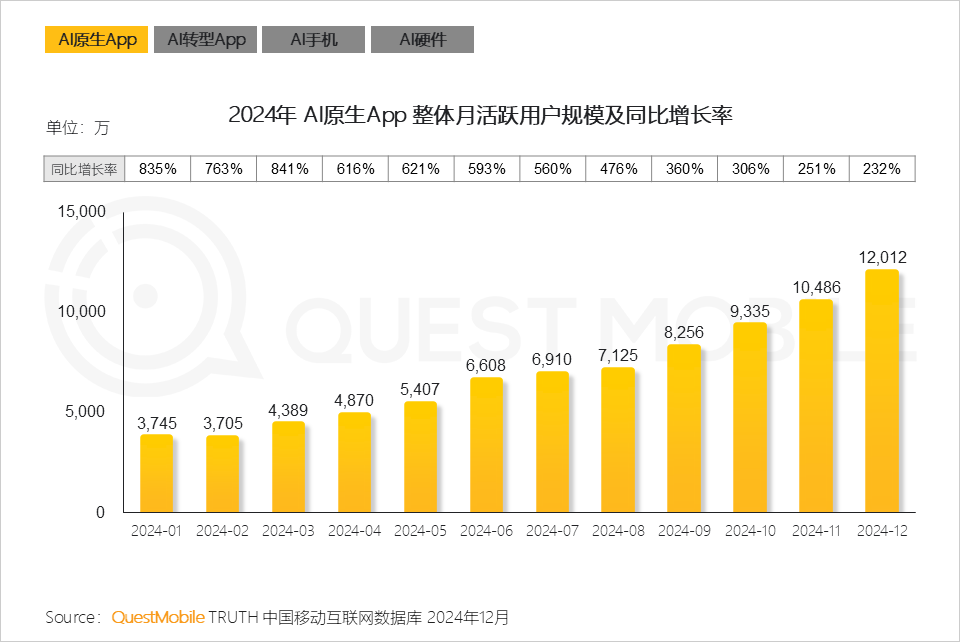 2、AI原生App用户规模一路走高,11月破亿,12月达到1.2亿,全民AI指日可待
