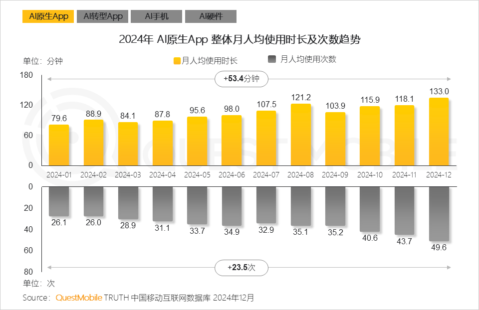 QuestMobile数据显示,2024年12月,AI原生App整体月人均使用时长达133.0分钟,较1月增加53.4分钟;月人均使用次数从1月的26.1次增加至49.6次。