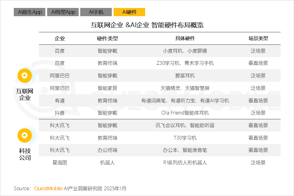 相比手机厂商直接在系统层面嵌入AI应用,互联网大厂、科技企业,则在AI原生APP之外,多方发力智能硬件,例如百度在智能穿戴、教育终端、智能家居方面打造了耳机、眼镜、学习机、平板机器人等,科大讯飞同样在智能穿戴、教育终端和办公终端方面打造了会议耳机、学习机和办公本、智能录音笔,等等。