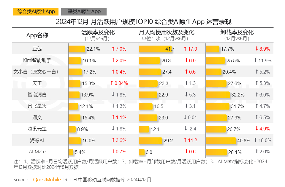 具体来看,AI原生APP在赛道划分上已经逐渐形成了基本的用户认可度,例如综合类AI原生APP方面,由于主打解决用户大部分场景需求的目标,容易出现口碑上的两极分化,导致活跃率、卸载率的表现不佳,不过,过去半年多,头部玩家已经持续在解决这方面的问题,豆包、Kimi、文小言“三强格局”已经形成,月活跃用户规模分别为7523万、2101万、1224万,2024年全年的复合增长率分别增长21.2%、69.4%、4.7%。