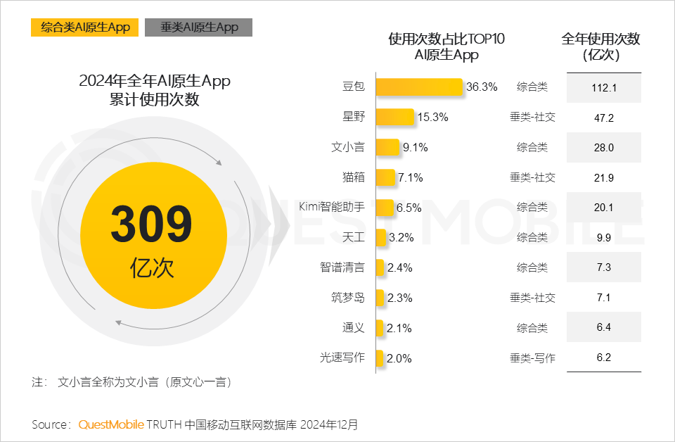 5、从具体数据来看,豆包、星野的全年累计使用次数占整体的50%;换句话说,一个综合类原生App,一个社交类原生App“夺走”一半用户注意力