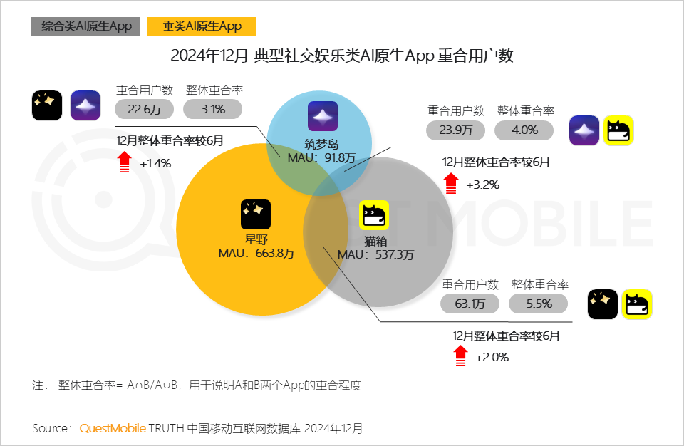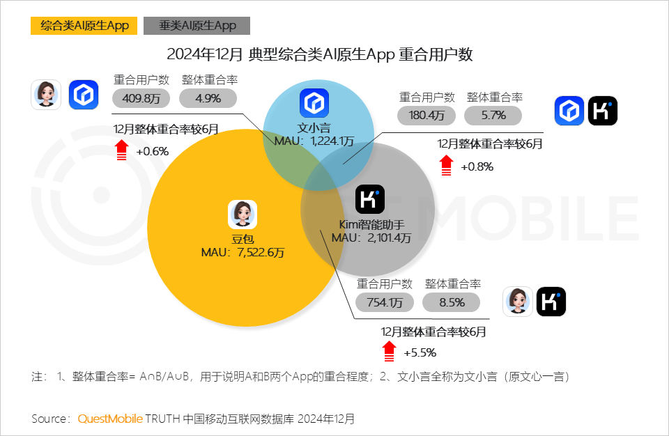 同时,虽然增量用户还有很多,且83.5%的用户只使用1个综合类AI原生APP,但是,“三强”之间的战争已经爆发,尤其是豆包的持续扩张,对文小言、Kimi带来了不小的挤压,数据显示,12月份,豆包与Kimi、文小言的重合用户已经分别达到754.1万、409.8万,相比6月份重合率分别上升了5.5%、0.6%,可以预见的是,2025年这场碰撞将会更加激烈。