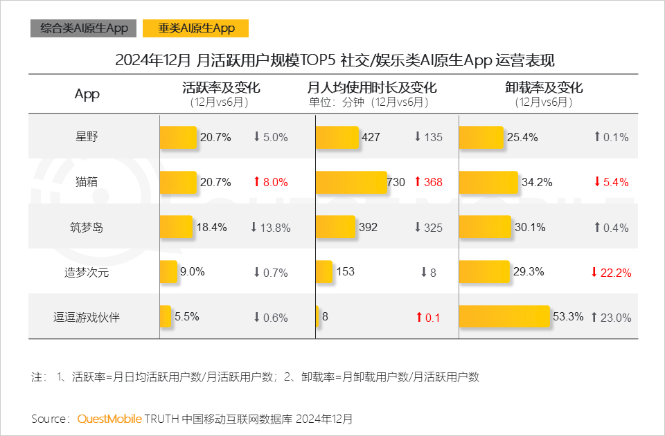 虽说星野流量TOP1, 但其运营指标较年中表现“逊色”;此外,筑梦岛的使用时长下降明显,也一定程度上影响了其活跃率问题;社交原生App尤其需要在用户沉浸、探索、满足三方面下功夫,才能真正成为用户“情感陪伴伙伴”。