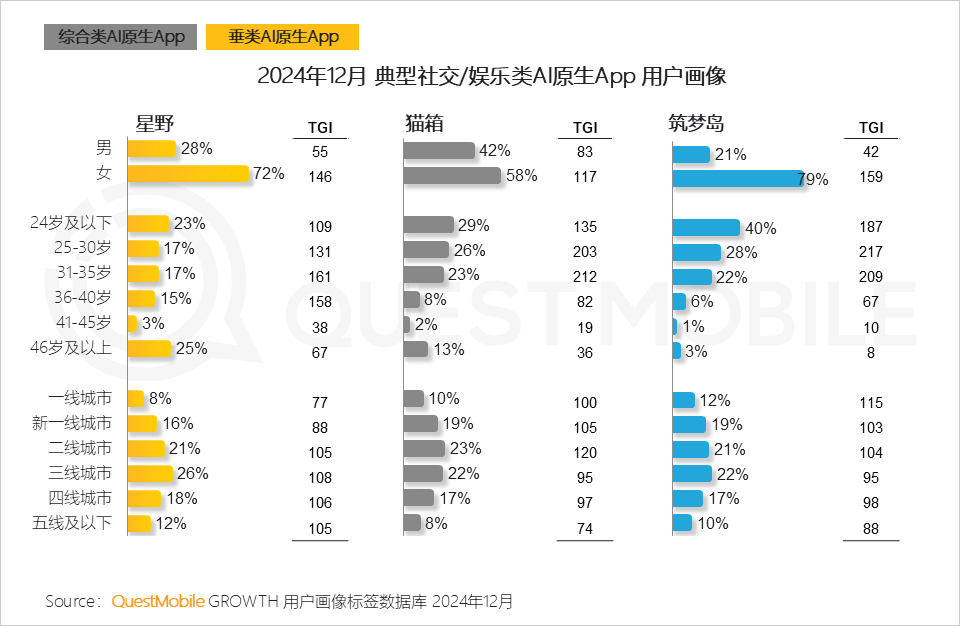 垂类AI原生APP赛道目前还相对“宽敞”,千万级应用尚未出现,社交类的“星野”、“猫箱”,写作类的“光速写作”,图像视频生成类的“即梦AI”,搜索类的“秘塔AI搜索”,月活跃用户分别为664万、537万、359万、196万、117万,位居前五位,从用户画像和使用粘性上看,还有很多发展空间。