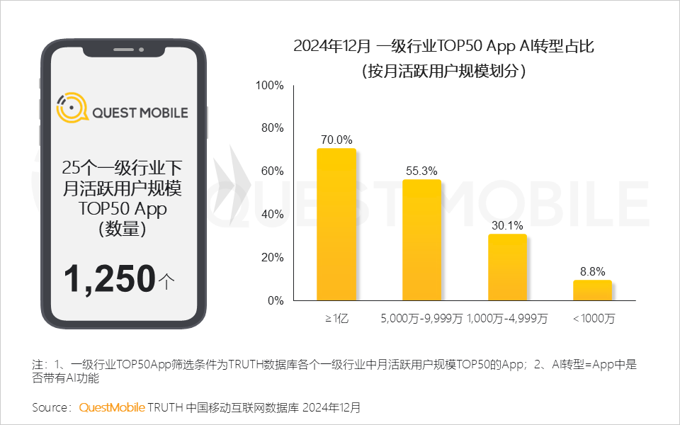 1、AI的到来,每个App都难以“置身事外”, 头部App反应更为迅速;QuestMobile数据显示,规模在亿级以上的App中有70%正在“转型路上”