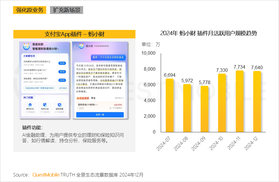 5、支付宝推出AI金融助理插件—蚂小财,可以提供专业的投资理财咨询建议;插件月活突破七千万用户