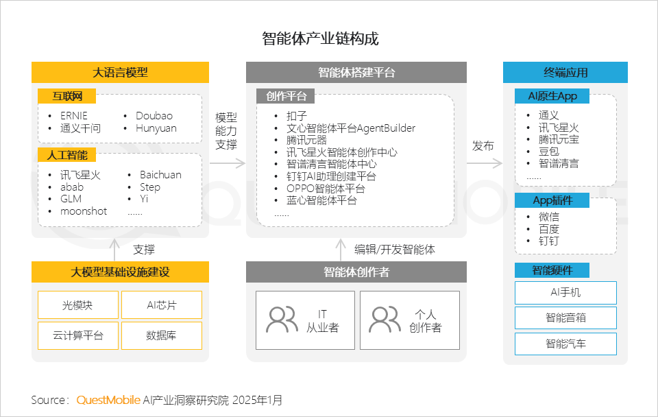 这也让智能体数量一举超过了小程序数量(MAU大于1万,7000+),仅次于APP数量(MAU大于1万,127000+),而按照当前的发展速度,2025年,智能体的数量将迎来惊人爆发……