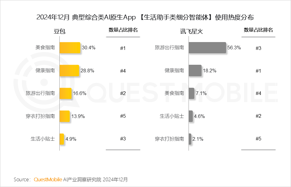 QuestMobile数据显示,豆包-美食指南类智能体占比31.3%,讯飞星火-健康指南类占比25.3%,腾讯元宝-旅游出行指南占比45.7%。
