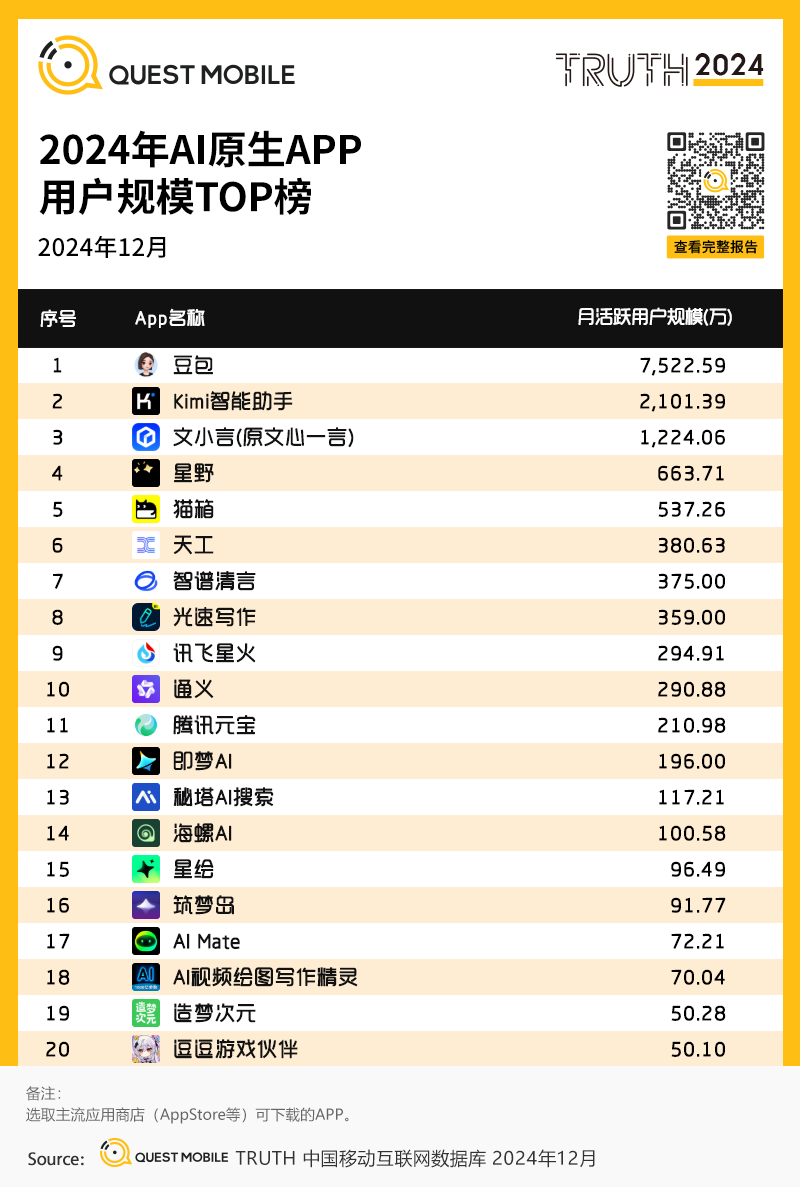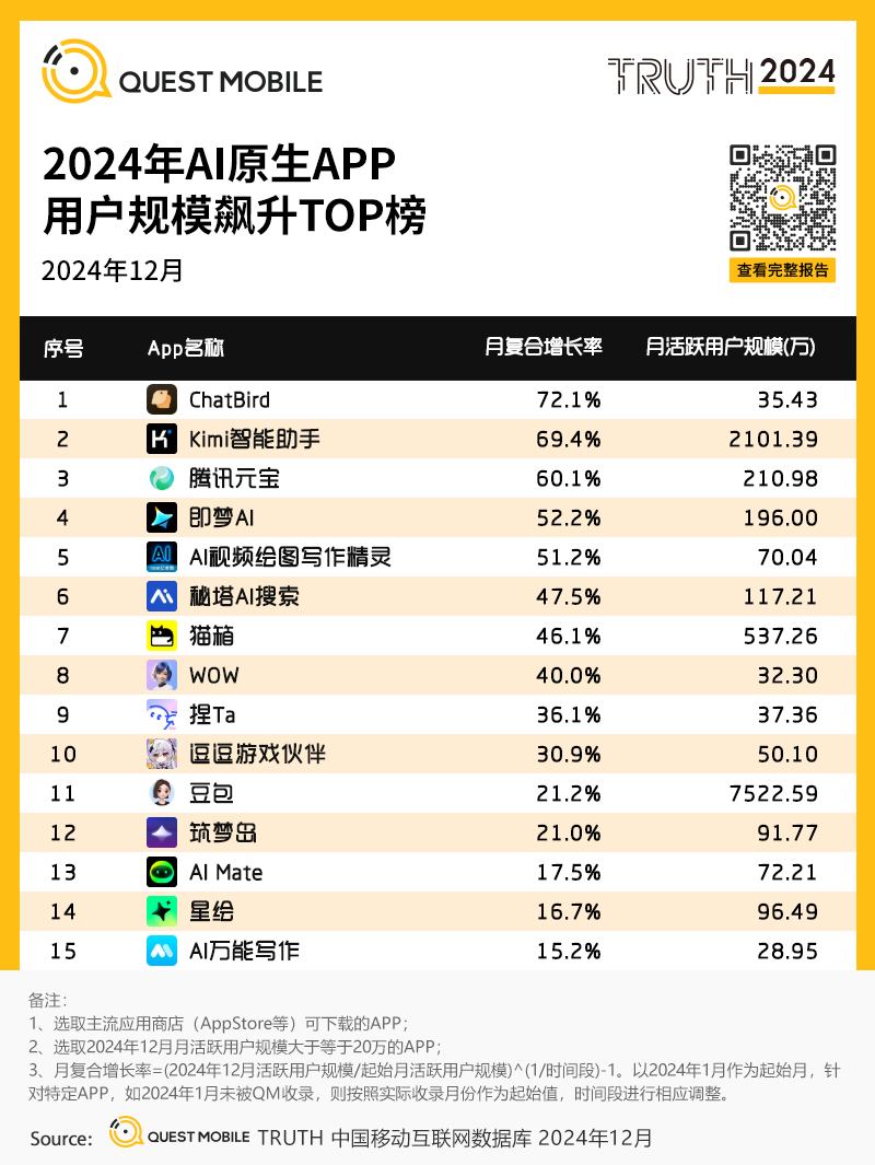 当然,最重要的“智能体”在2024年得到了长足的发展,从上游的大模型、基础设施,中游的智能体开发生态(平台及创作者),下游的AI落地应用,相对独立的产业链也已经形成,截止到2024年12月,头部综合类AI原生APP中的智能体数量已经超过102000个,相比10月份增长了41.7%!