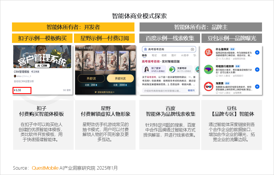 13、智能体已初步实现商业化落地,主要分为直接收费及为其他品牌引流两种模式;得益于高适配性,未来智能体的引流能力存在较大的增长潜力