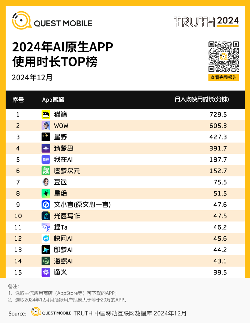 QuestMobile数据显示,截止到2024年12月,AI原生APP月度活跃用户已经突破1.2亿,同比增长232%,同时,用户粘性也持续增长,整体月人均使用时长达133.0分钟,月人均使用次数也达到49.6次。