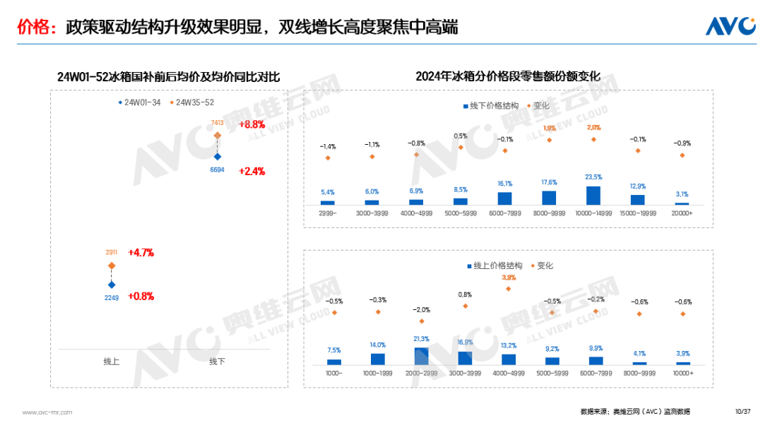 政策驱动下,冰箱市场结构溢出效应凸显。相较于政策落地前,产业结构升级动力显著放缓。奥维云网(AVC)监测数据显示,24W01-34,冰箱线上、线下市场均价同比增长仅有0.8%和2.4%。政策落地后,线上市场均价同比提升至4.7%,线下市场均价同比提升至8.8%。市场充分利用行业一级能效渗透率居高这一特点,极大程度放大了补贴这一措施对行业价格结构的正向影响。从结果看,冰箱线上市场需求从3K以下向4-5K聚集,线下需求则聚焦至8K+,部分企业推出“超额补贴”,以促进万元以上产品的消费。综合来看,上半年冰箱市场的消费降级趋势被扭转,性价比用户池稳定的同时,中高端市场的消费潜力被有效激活。