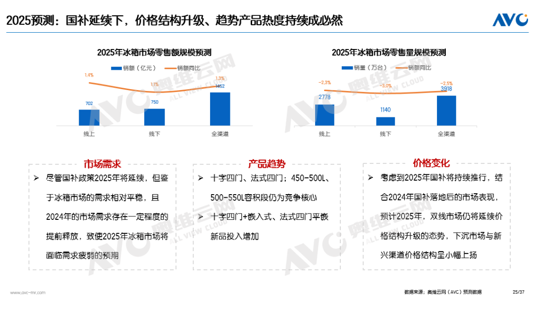 从产业外部环境看,2024年国补对2025年的需求形成了一定规模的“前置”。而在国补政策明确延续的背景下,资金规模大小则很大程度上影响到2025年的需求释放力度。奥维云网(AVC)分析认为,以当前补贴力度来看,2025年的冰箱市场需求稳中微降,价格结构升级则将成为规模增长的核心驱动力。奥维云网(AVC)预测2025年全渠道冰箱销量为3918万台,同比下降2.5%;全渠道销额为1452亿元,同比增长1.3%。