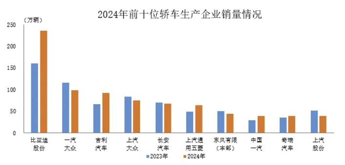 1月21日,据中国汽车工业协会统计分析,2024年,销量排名前十位的轿车生产企业共销售791.5万辆,占轿车销售总量的68.7%。在上述十家企业中,与上年同期相比,比亚迪股份、吉利汽车、上汽通用五菱、中国一汽销量均呈两位数增长,奇瑞汽车销量小幅增长,其他企业销量呈不同程度下降。