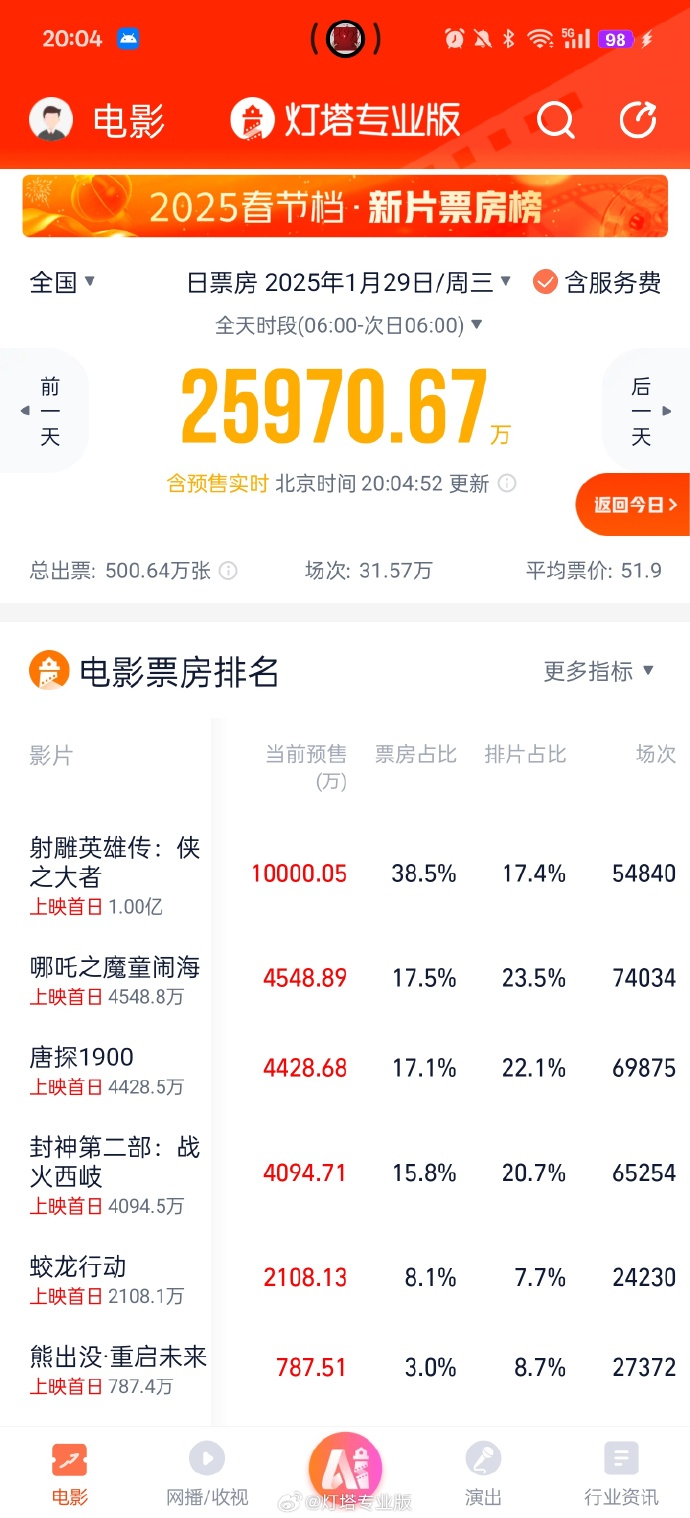 据灯塔专业版,截至1月21日20时4分,影片《射雕英雄传:侠之大者》上映首日(大年初一)预售票房突破1亿元。