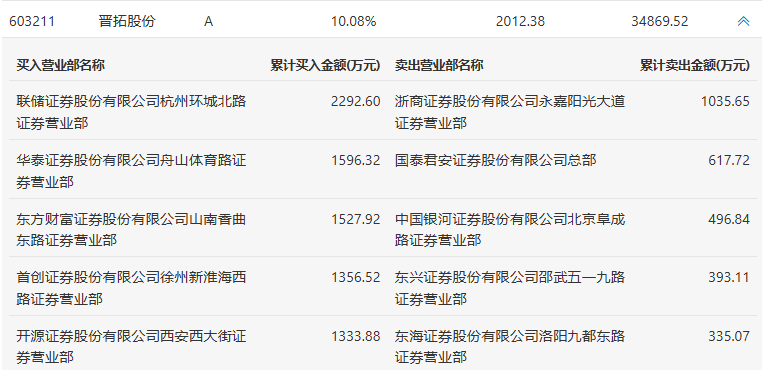 晋拓股份今日涨停,龙虎榜数据显示,上榜营业部席位全天成交1.1亿元,占当日总成交金额比例为31.5%。其中,买入金额为8107.25万元,卖出金额为2878.39万元,合计净买入5228.86万元。