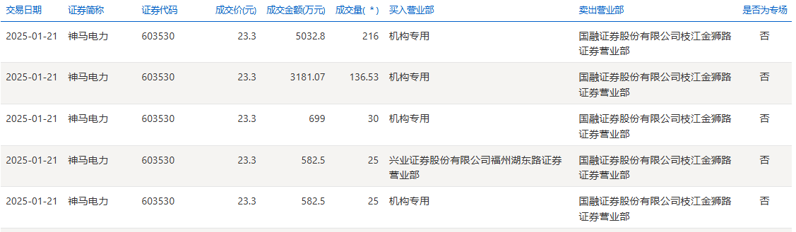 神马电力1月21日大宗交易成交432.53万股,成交额1.01亿元,占当日总成交额的48.84%,成交价23.3元,较市场收盘价25.16元折价7.39%。