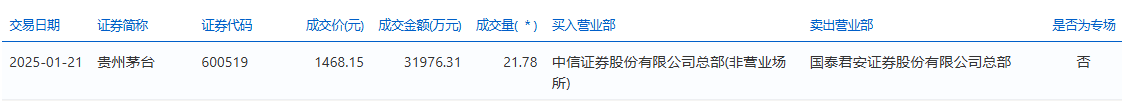 贵州茅台今日大宗交易成交21.78万股,成交额3.2亿元