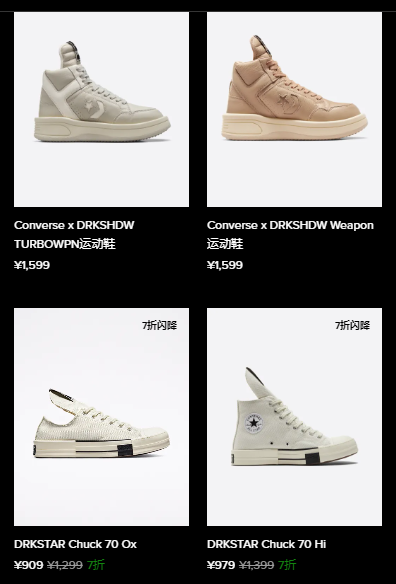 原价在1200-1600元一双的美国设计师“暗黑大帝”Rick Owens与匡威联名款,曾被炒至3000元左右一双,如今部分在官方商城已大打七折,在奥莱货架400-600元左右即可带走。