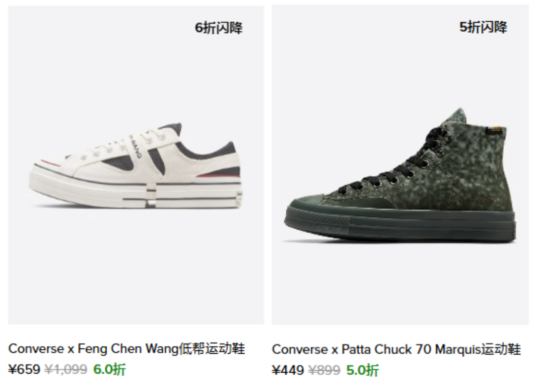 例如,Converse x陈冠希Clot的“大熊猫”曾尺码齐全被摆上奥莱货架;Converse x 新锐设计师Feng Chen Wang的低帮运动鞋官网给出6折优惠;Converse x潮牌Patta 的Chuck 70 Marquls运动鞋价格大打对折……