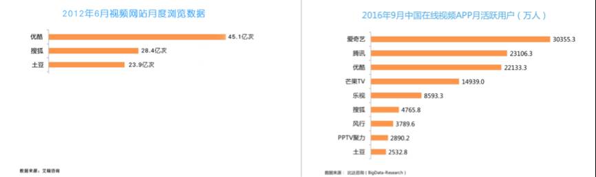 据艾瑞咨询数据显示,2012年土豆市场份额位列优酷与搜狐之后,稳居前三。但到了2016年9月,土豆App月活跃用户为2532万人,仅为爱奇艺月活人数的8%。从被收购前需提前几周预订广告,到到近期大片广告档期无人购买,阿里如优酷一样无力阻止土豆市场份额流失的节奏。