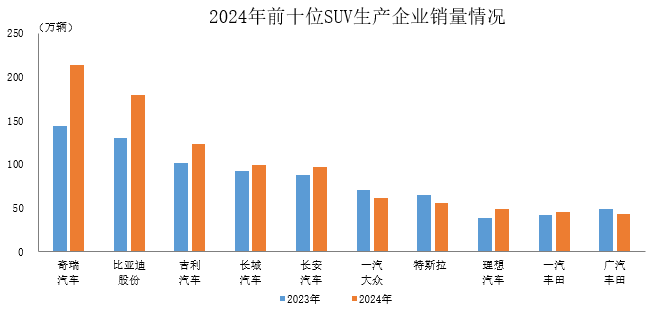 据中国汽车工业协会统计分析,2024年,销量排名前十位的SUV生产企业共销售964.2万辆,占SUV销售总量的65.5%。在上述十家企业中,与上年同期相比,一汽大众、特斯拉和广汽丰田销量呈两位数下降,其他企业销量均呈不同程度增长。