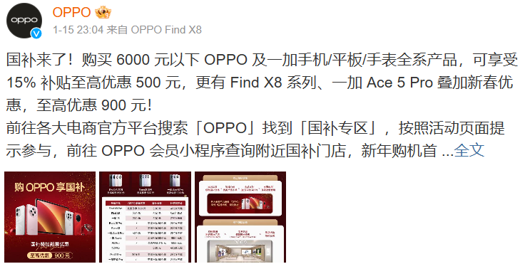 自1月20日起,国家补贴政策正式实施。消费者购买售价不超过6000元的OPPO手机、平板、智能手表等产品,可按实际售价享受15%的补贴,单件商品补贴价不超过500元(3333元以内按15%补贴,3334-6000元立减500元,6000元以上无补贴)。而这一轮国补几乎涵盖了OPPO&一加在中高端市场的所有主销机型以及平板、手表。