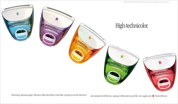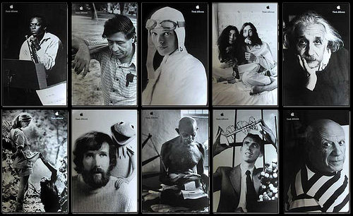 艺术总监Craig Tanimoto提出了“Think Different”这个点子并把它发扬光大,他们选出来自各个领域、打破传统思维模式的标志性人物,比如爱因斯坦、希区柯克、鲍勃·迪伦、马丁·路德·金、约翰·列侬、卓别林、毕加索、甘地、爱迪生等等,把他们的大幅黑白肖像印制成平面广告,并在角落里打上苹果标志和广告语Think Different,除此之外没有任何说明文字。