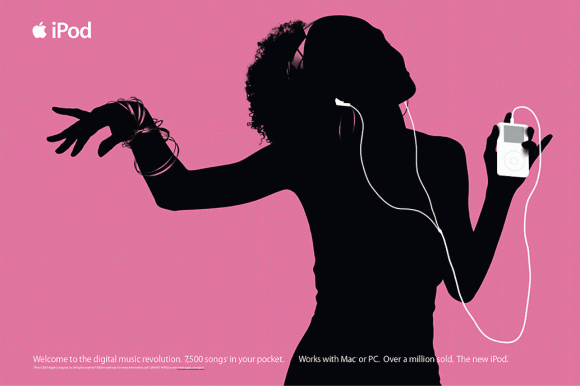 比如苹果的iPod广告不是展示产品,而是创造标志。2003年的这支广告中,二维剪影的人形在鲜艳背景中尽情舞蹈,广告里没有任何产品照片,iPod和耳机也以剪影方式出现。苹果没有要求观众购买产品,而只要求人们认同广告中的情感。