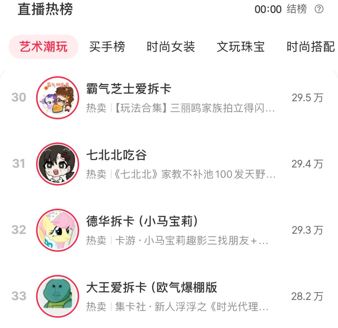 比如2024年年初开始在小红书代拆卡游生产的相关IP周边的霸气甜妹爱拆卡,因“人美声甜”一年不到粉丝上涨到119万,单周涨粉最高达到14万人,如今,她的拆卡直播间在线人数通常能达到数百人。此外,2024年年底才开始发力的老碌拆卡,近期也是小红书直播热榜中艺术潮玩类榜单上的常客,他的直播间销售的IP周边则是宝可梦相关产品。