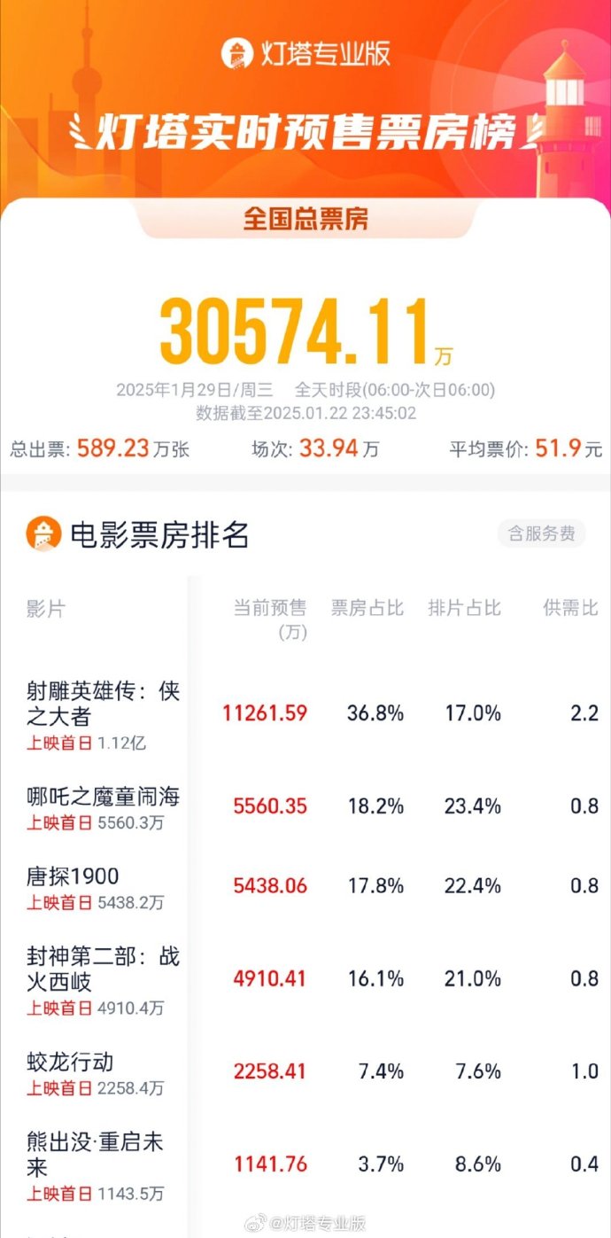 据灯塔专业版,截至1月22时23时,2025年春节(大年初一当日)预售票房突破3亿。