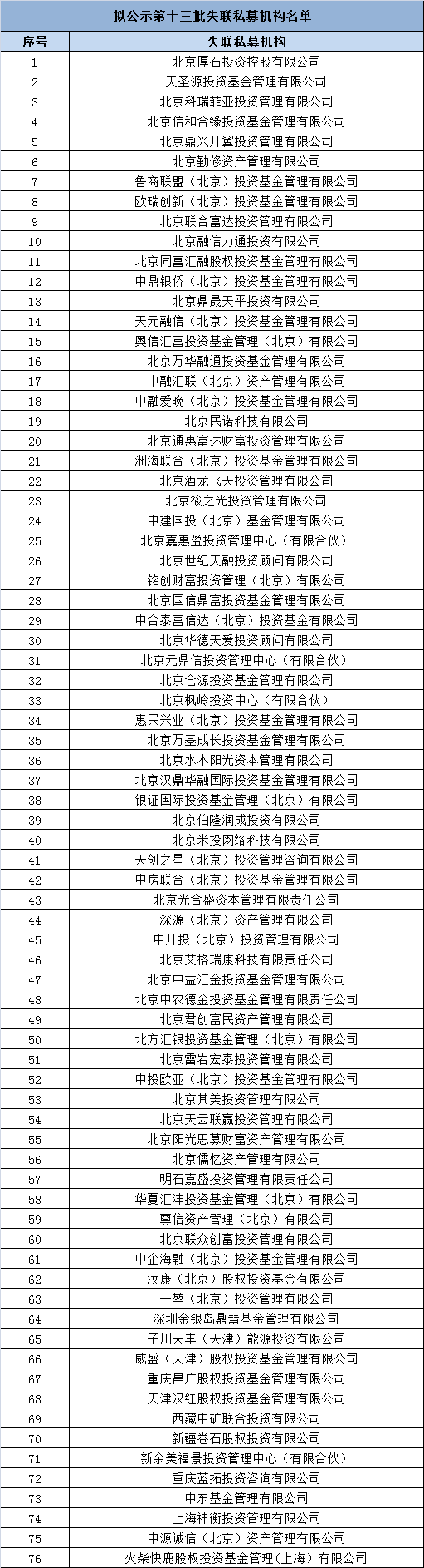 中基协表示,自律核查工作涉及到北京厚石投资控股有限公司等76家机构。其中,北京证监局通过现场核查、官方网站公示及《中国证券报》发布公告等方式均无法与附件《拟公示第十三批失联私募机构名单》中第1至74家机构取得联系,协会通过私募基金登记备案系统预留的电子邮件亦无法与上述74家私募基金管理人取得联系。