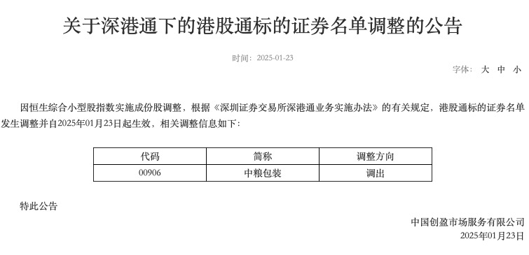 深交所1月23日公告,因恒生综合小型股指数实施成份股调整,根据有关规定,港股通标的证券名单发生调整并自2025年01月23日起生效,调出中粮包装。