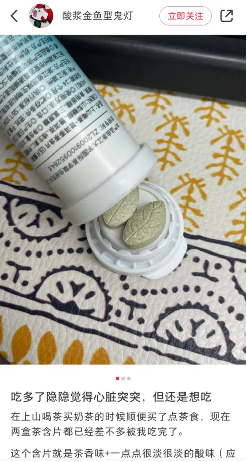 或是茶含片与自己的需求适配度过高,吃到停不下来的“受害者”已经出现。网友“酸浆金鱼型鬼灯”抱怨自己咖啡因不耐受,“吃到心脏突突,但还想吃”。