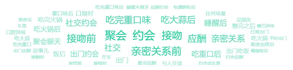 这也对应着品牌们覆盖的多是强需求场景,如约会、聚会、吃完重口味食物后,意在用社交尴尬、更加强烈的生理不适感,让用户需求从痒点上升为痛点,从而最大化实现目标人群的销售转化。