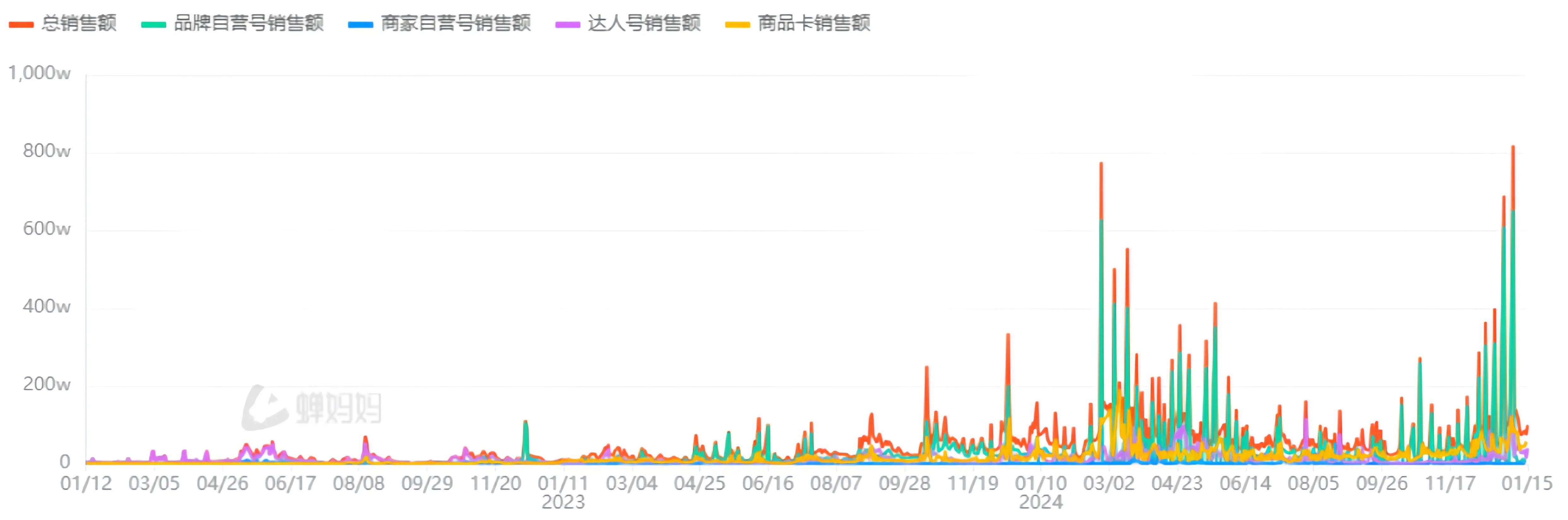 进入抖音初期,茶口乐借助老师、导游及食品类目达人直播,打开销量。而截至目前,抖音直播依然是茶口乐触达目标客群最重要的途径之一。2024年茶口乐直播销售额在抖音总销售额中占比45.39%。[1]