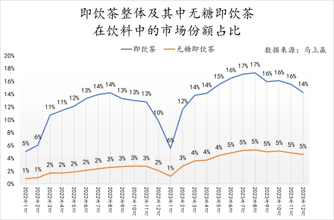 根据马上赢数据,无糖茶市场2022年经历了一整年的爬坡后,在2023年迎来爆发,原有入局者不断加强市场教育、持续向渠道渗透;明星产品销售规模不断扩充,东方树叶成为百亿元大单品[3];茶小开、东鹏等新入局者涌入、密集推新品,据媒体不完全统计,2023年仅是“乌龙茶味形”新品就超过120余种[4]。