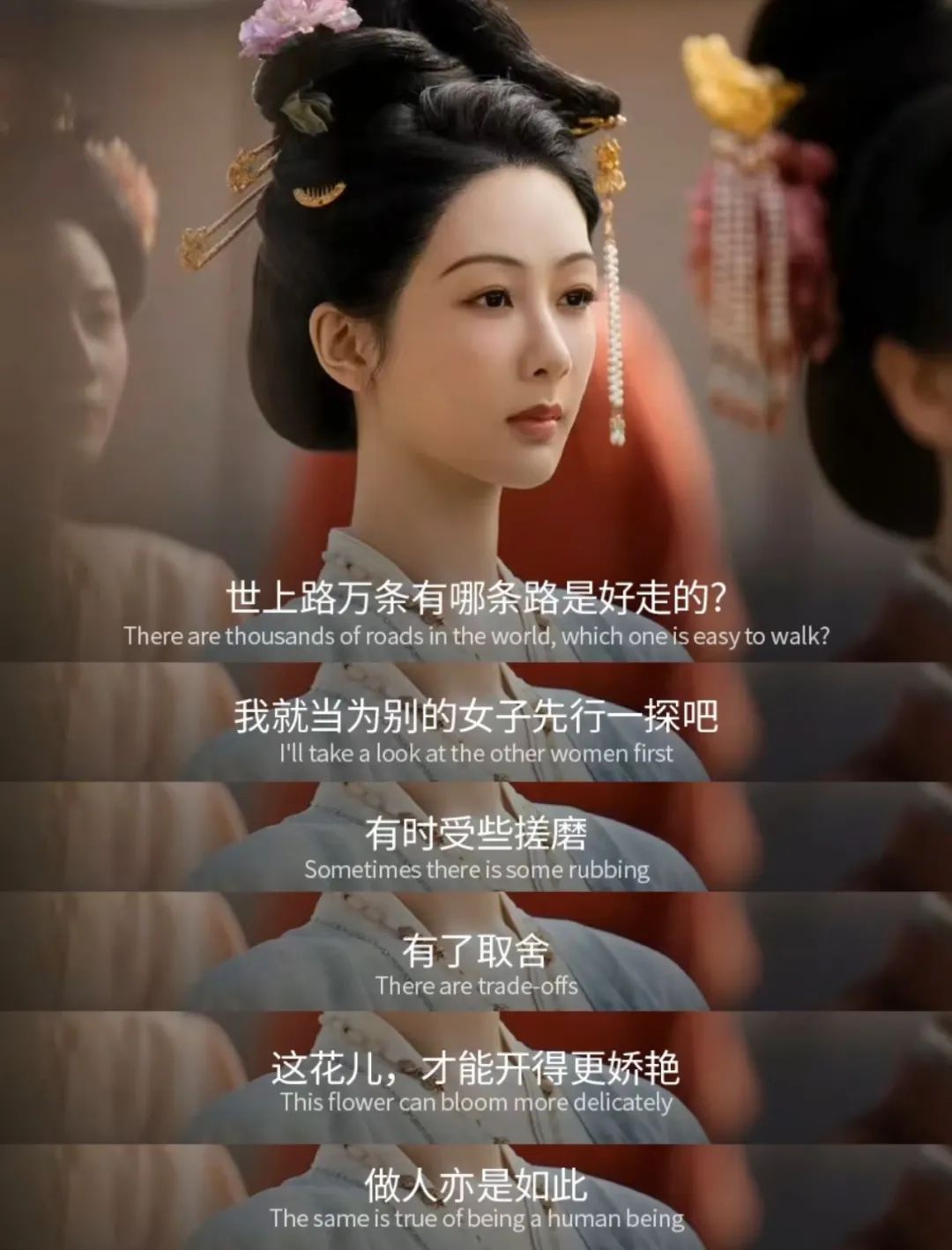 这些感慨偶尔来几句倒也无妨,可怕的是它们充斥在女主的一言一行中。行走的金句大师,理论武装的花卉教母。再好的妆造加身,也让人感觉性缩力满满。芳华正茂却这般忘情绝爱,不若剃度做个姑子,别来为难我们这些满脑子花前月下的性缘脑了。