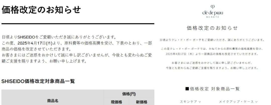 其中,资生堂、CPB品牌在官网发布的通知显示,此次涨价原因主要是原材料的价格上涨,将从4月17日开始,修改部分产品的价格。前者主要包括保湿霜、化妆水、化妆工具等在内的产品,将涨价1%-10%左右。