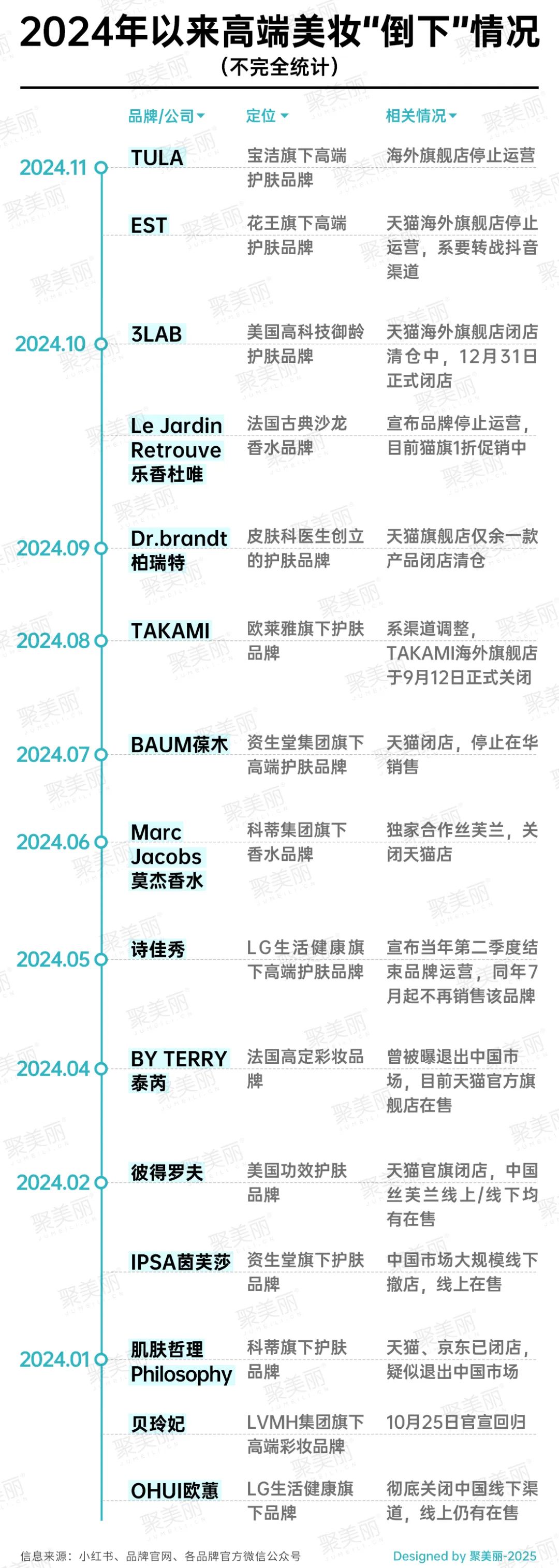 另外,据聚美丽不完全统计,近年来已经有SK-II、雅诗兰黛、资生堂、IPSA茵芙莎、Whoo后、雪花秀、莱珀妮等明星高端品牌出现下滑,或被传出在华大规模撤柜等负面消息。