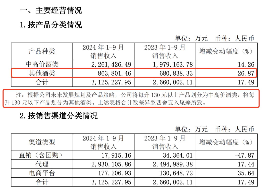 紧随其后的是牛栏山。回顾2021年,牛栏山在光瓶酒市场的占有率为8%,而玻汾为5%。但随后迎来了销量滑坡,其中牛栏山品牌下的拳头产品42度500ml牛栏山陈酿酒(即白牛二)销量在2021年-2023年分别同比下滑5.19%、23.72%、18.29%。到了2024年上半年,不仅白牛二录得4.45%同比下滑,作为公司品牌升级的重要抓手——金标陈酿销售量同样同比下滑46.38%。