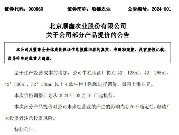 成本上升是光瓶酒价格上探的直接驱动因素。牛栏山旗下的几款产品就是如此,顺鑫农业于2024年1月发布公告称,因生产经营成本增加,牛栏山酒厂决定对42°125ml、42°265ml、42°500ml和52°500ml等四款牛栏山陈酿产品进行调价。整体涨价幅度不大,每箱上涨6元,涨幅约为个位数。
