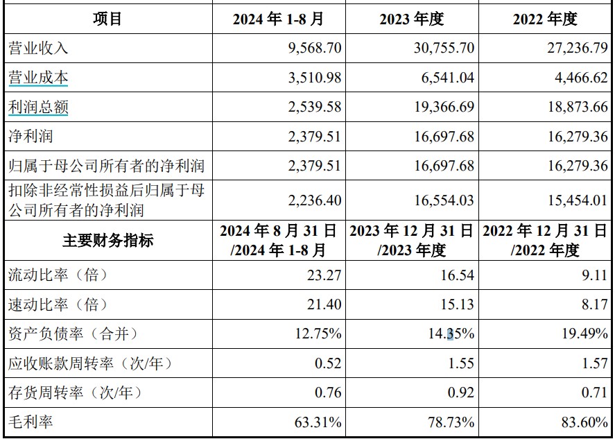 科凯电子2022年和2023年收入分别为2.72亿元和3.08亿元。2024年前8月,公司收入为9568.7万元,未达到上年收入的三分之一。与此同时,公司2022年、2023年和2024年前8月归母净利润分别为1.54亿元、1.66亿元和2236万元。