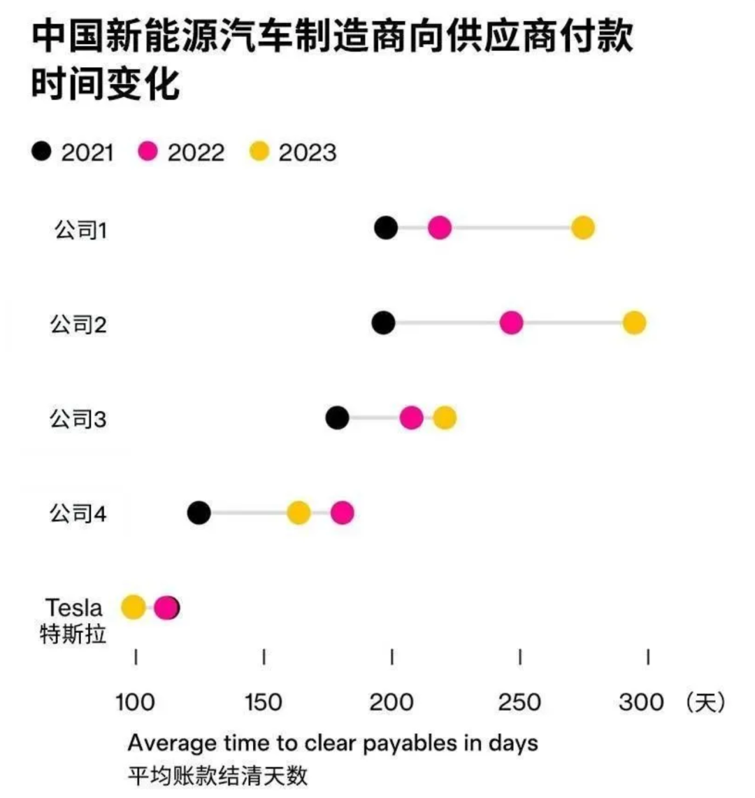 但即便是这样的“千亿大佬”,也难逃账期被拉长的困局。2024年年底,特斯拉副总裁陶琳发布了一张车企向供应商付款周期的对比图。她指出,特斯拉的付款周期已缩短至90天左右,远低于中国友商。一时间,国内车企账期过长的问题被推上热搜。