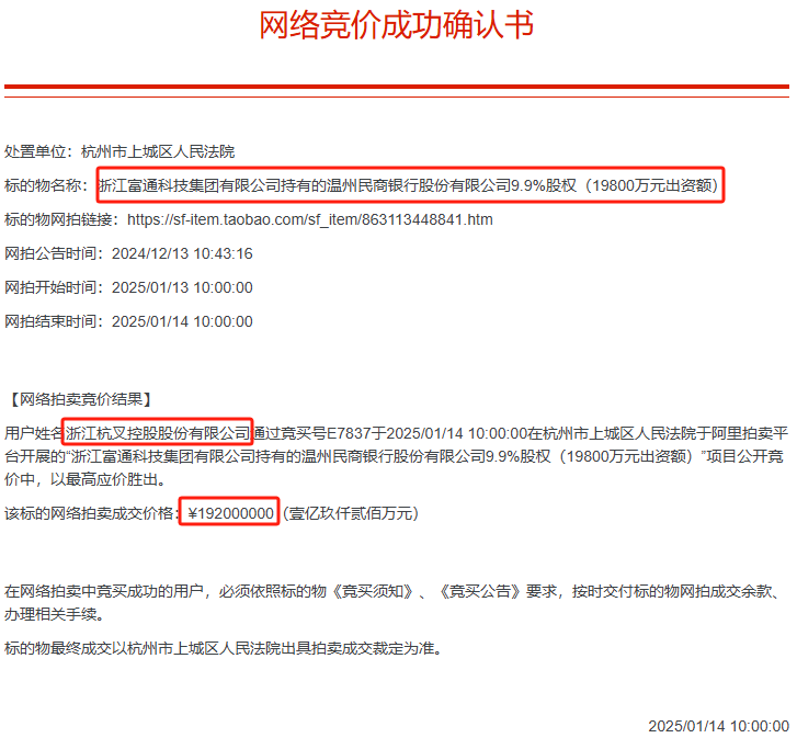 2025年1月13日10点,浙江富通科技持有的温州民商银行9.9%股权(1.98亿元出资额)在阿里拍卖平台开拍,随即被杭叉控股以1.92亿元拍下,而该笔股权此前评估价、起拍价均为1.92亿元。