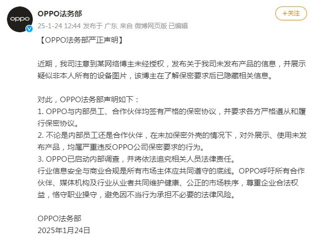 1月24日,OPPO法务部发文称,近期,我司注意到某网络博主未经授权,发布关于我司未发布产品的信息,并展示疑似非本人所有的设备图片,该博主在了解保密要求后已隐藏相关信息。