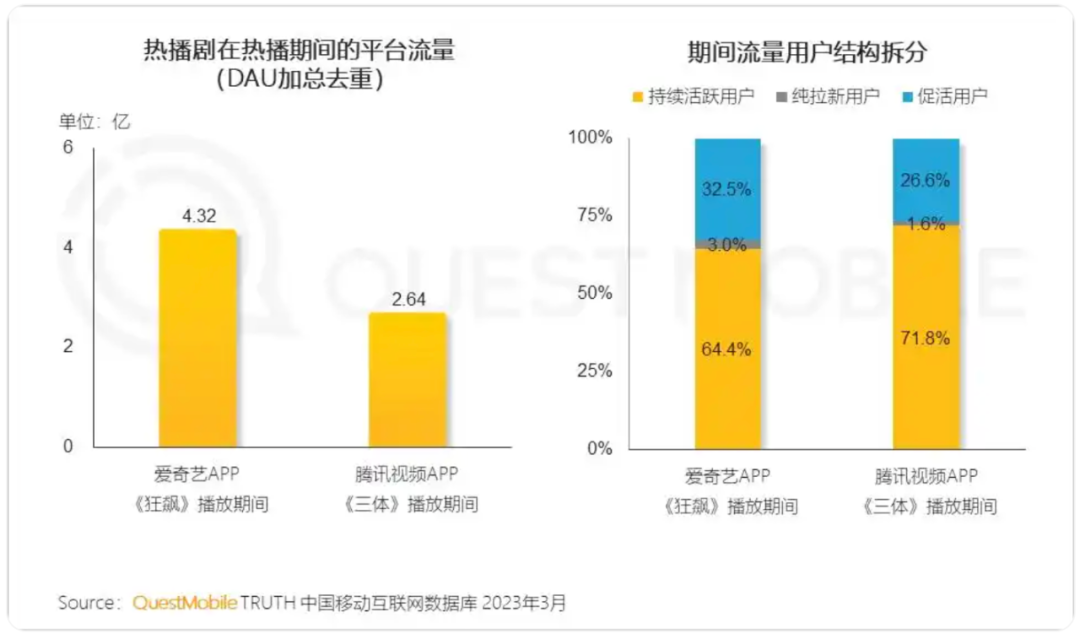 以2023年春节档为例,《2023中国移动互联网春季大报告》显示,《狂飙》《三体》播放期间,爱艺奇和腾讯视频平均每天获得768万和372万的增量用户。一部现象级全民爆款,可以直接提升长视频行业的用户水位。试想一下,如果不是在春节期间播出,《狂飙》可能很难彻击穿各个社会阶层。