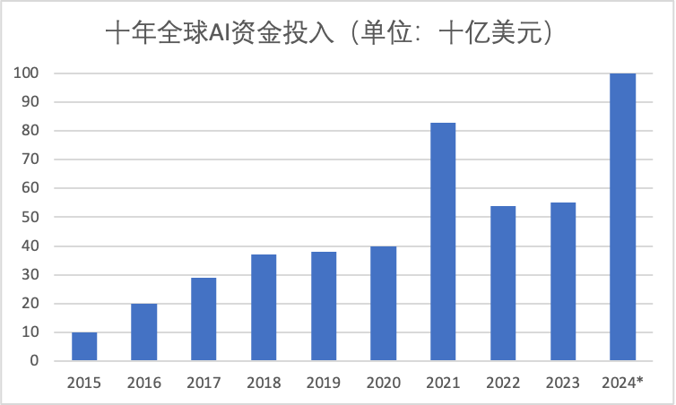 据第三方数据分析机构Crunchbase数据,截至2024年12月17日,2024年全球AI投资达到了1000亿美元的历史新高,比十年前增长了10倍。